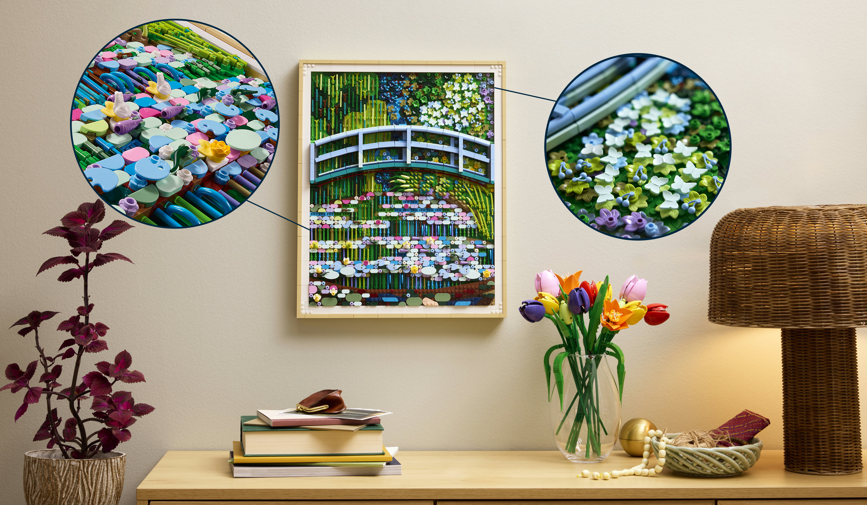 這次在主體設計中,樂高設計師為了呈現原畫作中的場景層次,特別將以往熟悉的零件換上新顏色,重新詮釋了樂高零件的意義,例如運用綠色的香蕉跟日本刀呈現河邊的草叢;以多種繽紛色系的蝴蝶表現出睡蓮的美感、並用櫻桃、調色盤、青蛙等零件,創造出不同顏色深淺的河濱風景,還有許許多多的精妙設計,等著玩家在拼砌過程中一一發掘!