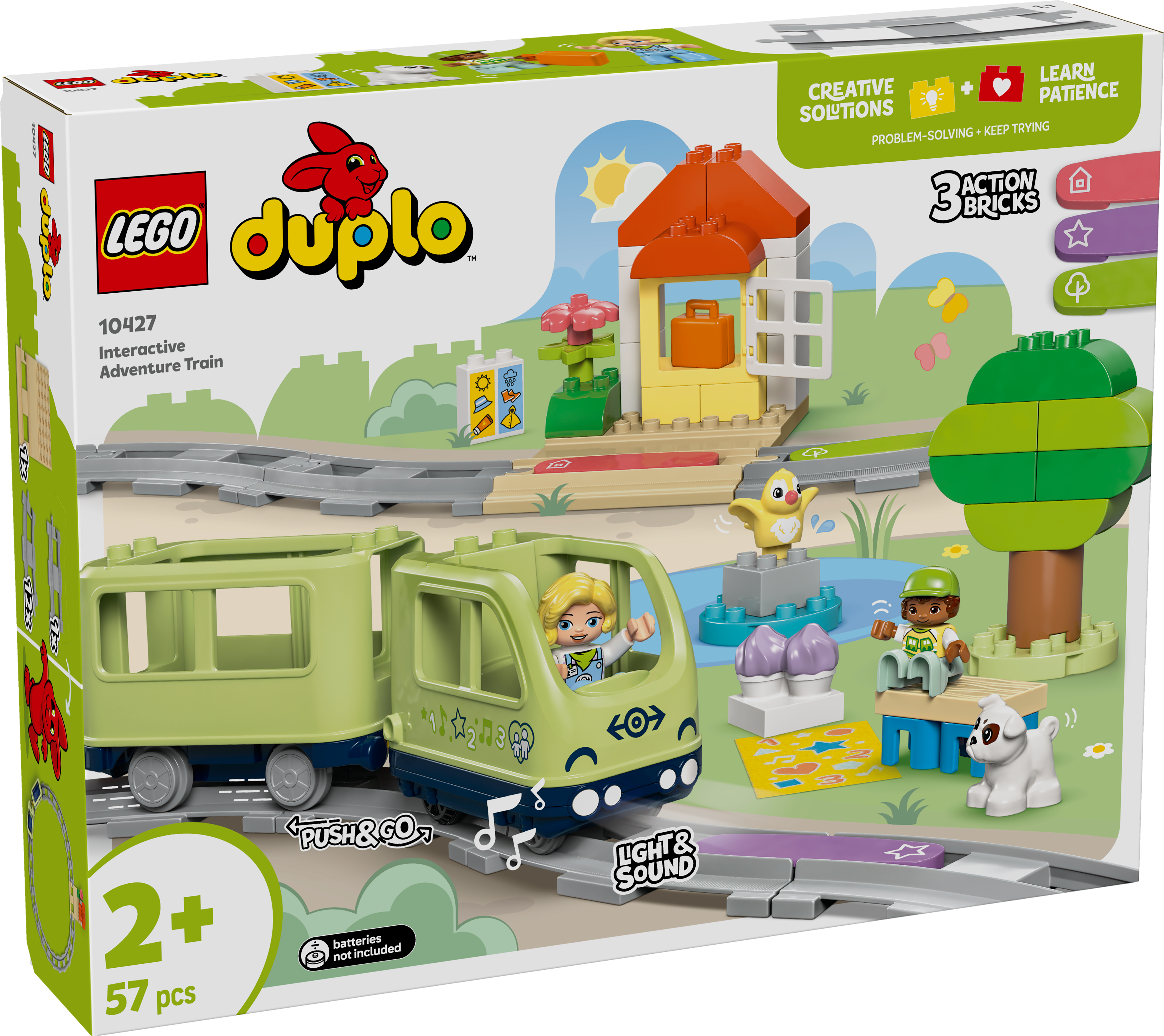 幼兒可用互動式冒險列車(10427)學前玩具坐上駕駛座。這款火車玩具適合 2 歲以上幼兒,讓學前兒童決定家庭旅行的目的地,然後展開充滿燈光、音效與學習的旅程。