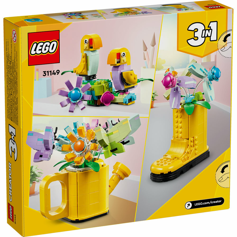 用這款樂高® 創意百變系列 3 合 1 插花澆水壺(31149)盒組拼砌、重新拼砌、遊玩與展示 3 種靈感來自大自然、色彩繽紛的模型。內有積木組成的黃色澆水壺玩具,包含握把和壺嘴。壺裡裝著 3 個花瓣可動的花玩具,另有 3 個裝在透明棍子上、讓人覺得在飛舞的蝴蝶玩具。