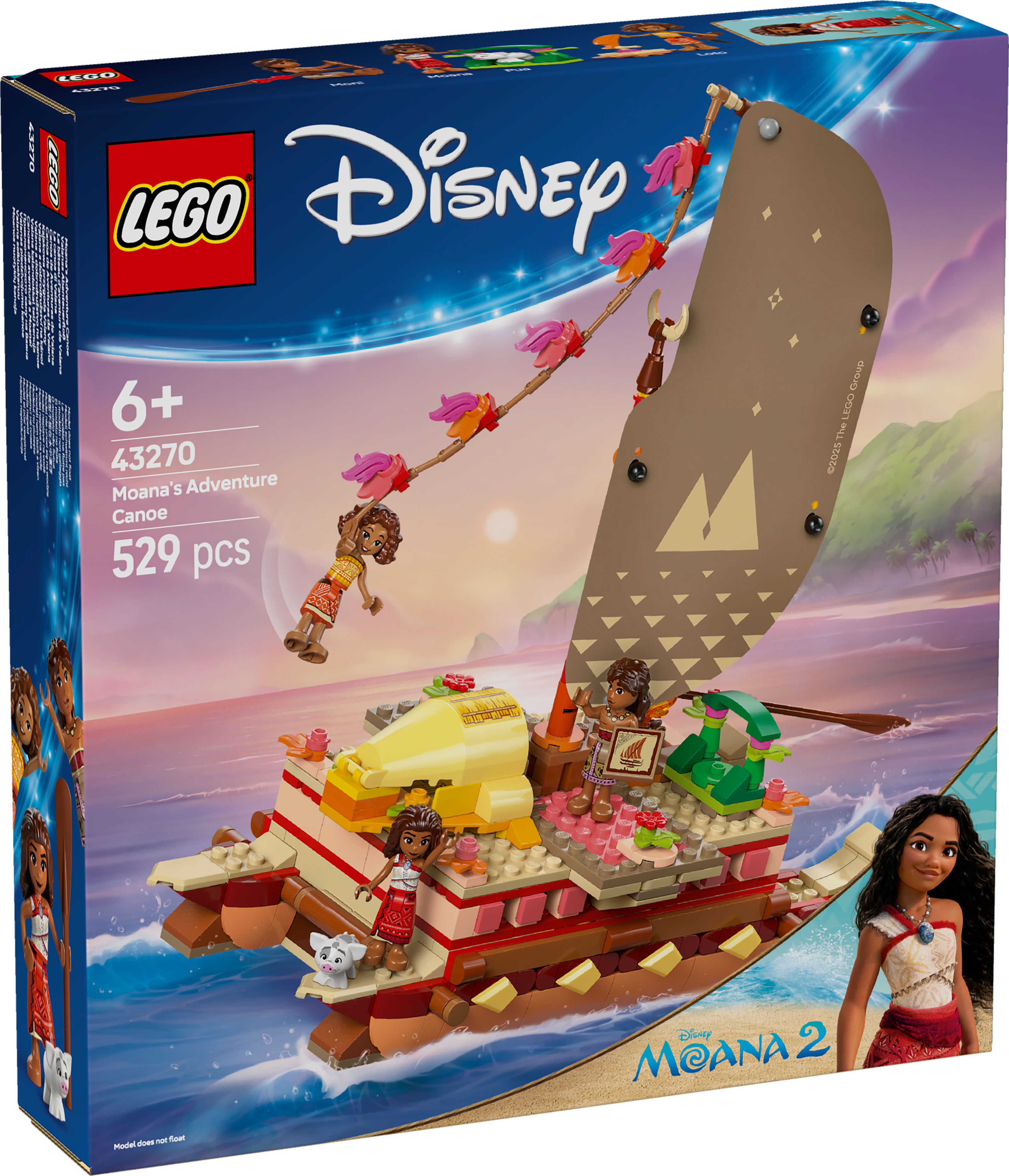 用這款樂高® 拼砌式禮品盒組讓迪士尼《海洋奇緣 2》的粉絲樂開懷,內有雙殼獨木舟、布帆與 3 個樂高迪士尼樂高娃娃。