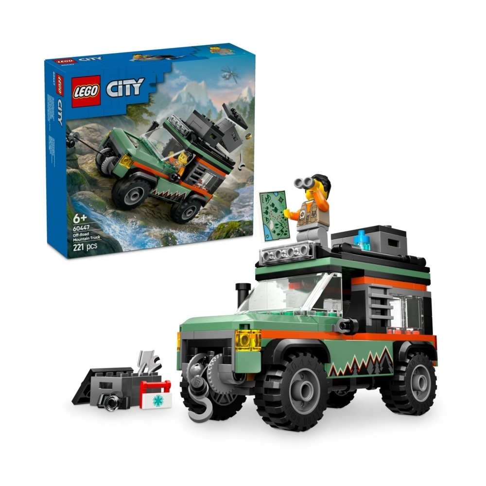 孩子可駕駛樂高® 城市山地四驅越野車(60447)冒險玩具前往山區。這輛堅固的卡車適合 6 歲以上玩家,配備許多適合越野探索的酷炫特色和設備,包括車頂置物箱、工具、耐用輪胎和能應對陡峭斜坡的可運作絞盤。