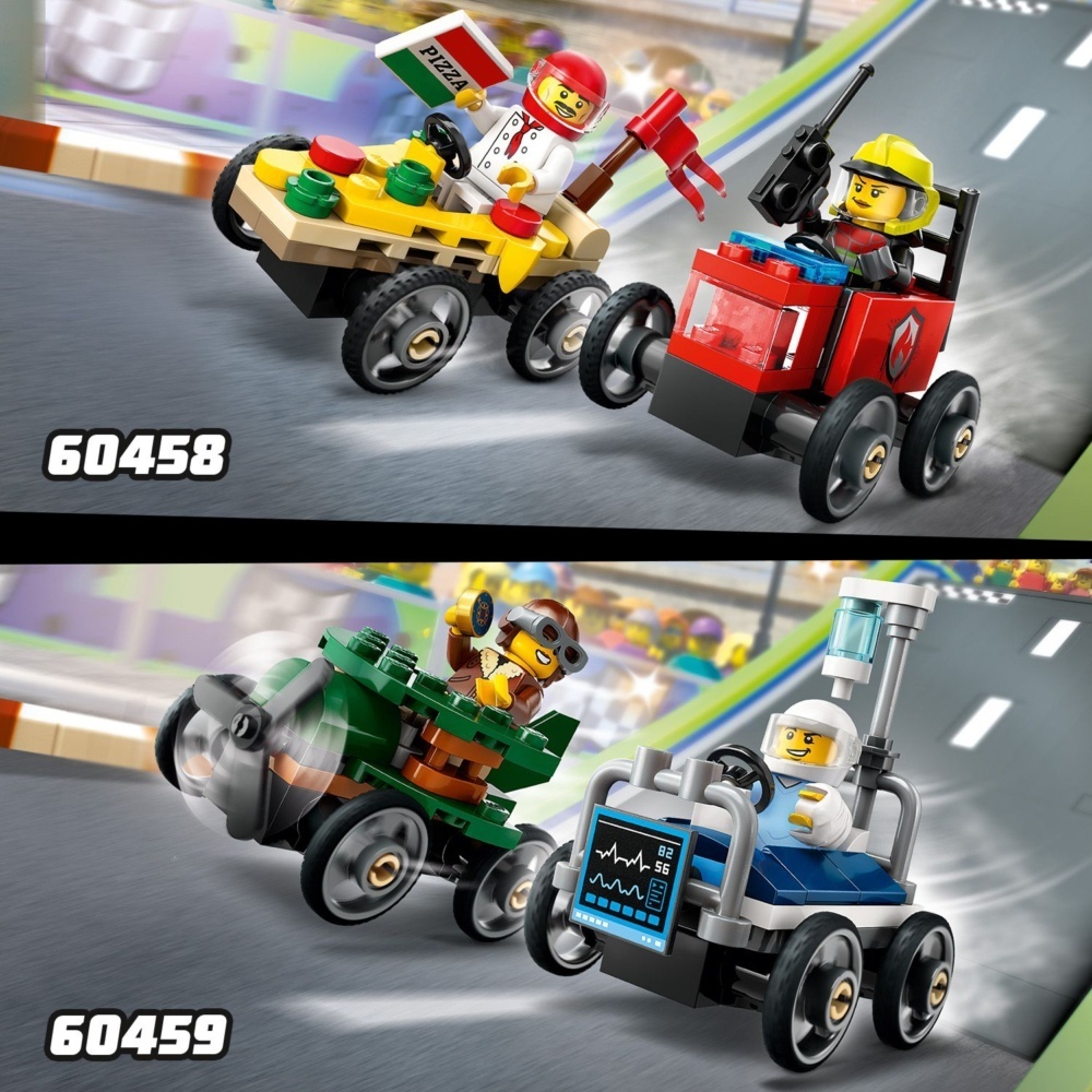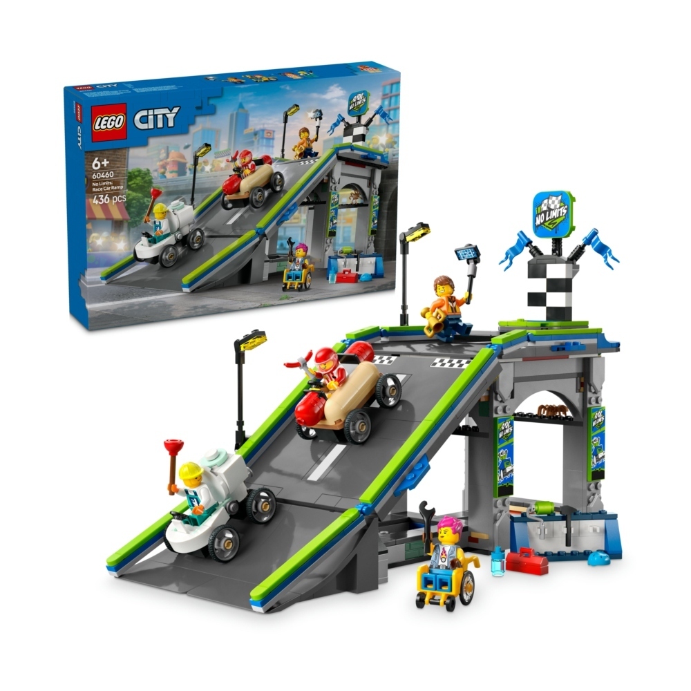孩子可用這款樂高® 城市沒有極限:賽車坡道賽道讓他們的皂飛車對決更加精采,內有 2 個皂飛車玩具與 4 隻人偶。