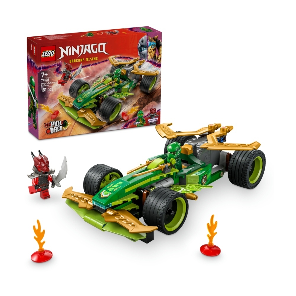 樂高® 旋風忍者® 勞埃德的迴力賽車盒組包含 2 隻人偶,讓孩子重現快節奏的忍者行動。