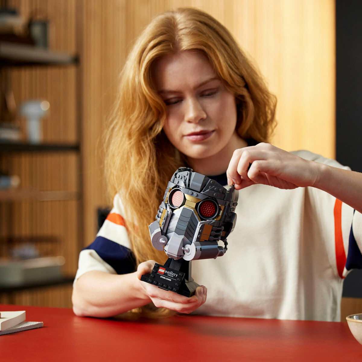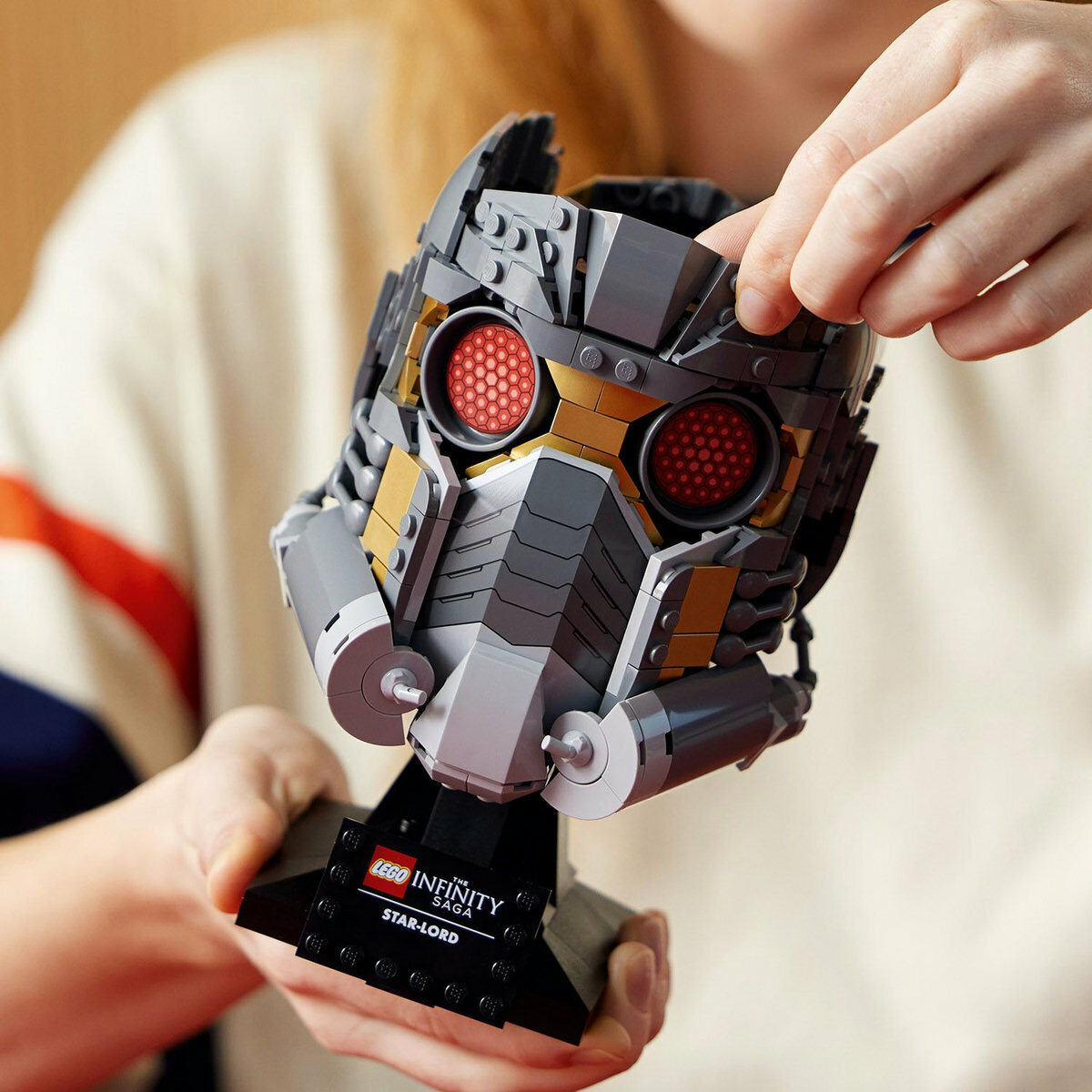 此 LEGO® Marvel Star-Lord’s Helmet 適合大人拼砌與展示